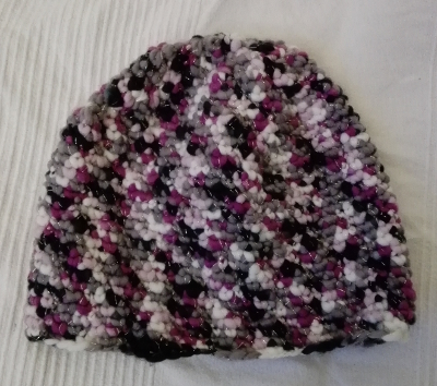 eine gehäkelte Mütze aus dickem Garn mit leichtem Glitzer
